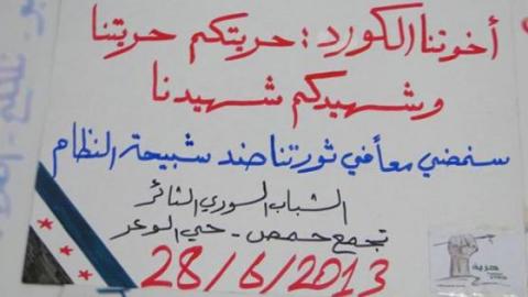 In Latakia, members of the Bees of the Coast movement held a sign that read, “Azadi (Kurdish for freedom), we are calling for freedom for Amuda. Here is Latakia, where the sea, the mountains and the valleys say: Amuda is part of my country.” In Homs, the Syrian Revolutionary Youth group held a sign that said, “To our Kurdish brothers: Your freedom is our freedom, and your martyrs are our martyrs. We will continue in our revolution against the regime’s thugs.”