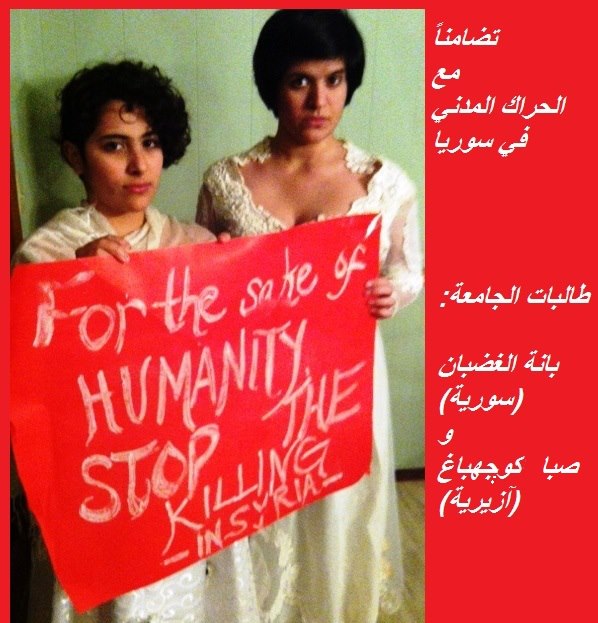 قامت كلّ من بانا الغضبان و صبا كوجهباغ بإرتداء فساتين بيضاء و حمل اللافتات الحمراء و التصوّر في أميركا للتضامن مع عرائس الحرية المعتقلات في سوريا. بانة و صبا طالبتان في أميركا، تنحدر بانة من خلفية سورية بينما تنحدر صبا من خلفية آزيرية