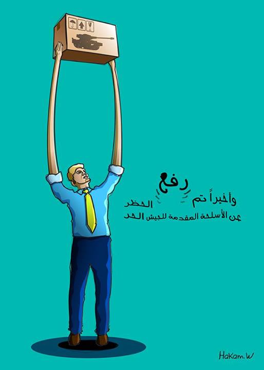 في تعليقه على خبر رفع حظر السلاح عن الجيش الحر , رسم الفنان حكم الوهب رج ذو أزرعة طويلة يحمل صندوق خشبي مغلق رسم عليه دبابة