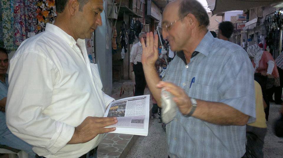 أثناء توزيع الجريدة في أحد أسواق الجزء الممسيطر عليه من قبل قوات الجيش الحر