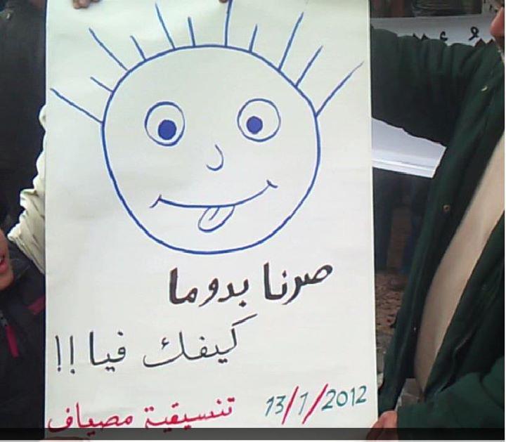 صرنا بدوما .... لافتة قام برفعها الناشطين الشباب من مدينة مصياف اثناء مشاركتهم لأخوتهم السوريون في مدينة دوما بريف دمشق تتحدى نظام الأسد الذي يفرض حصاراً امنياً على ناشيطن مدينة مصياف و الذي يدعي انه يقوم بحماية الأقليات من مجموعات متطرفة إرهابية