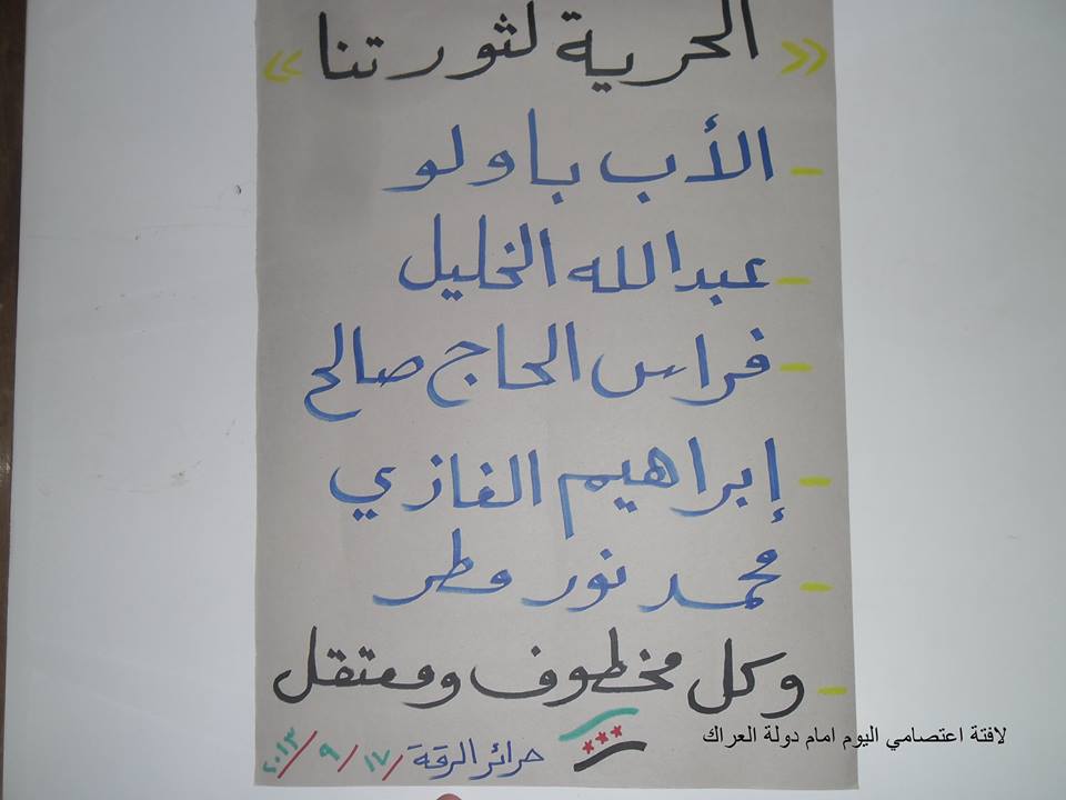 Lacking any form of resistance, ISIS subjected the city to a reign of terror through a policy of arbitrary detentions and systematic torture. At this stage civil work and protest in the city had almost come to a complete halt, with the few exceptions of brave individuals like Souad Nofal who stood up to ISIS. The next phase of ISIS’s rule involved a systematic manhunt against all local notables, activists and city council members including Abdullah Khalil, Firas al-Hajj Saleh, Ibrahim al-Ghazi.