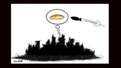 Even under such extreme circumstances, Syrian Palestinians have shown the extent of their solidarity. On one of the rare occasions in which the regime allowed a few baskets of food to enter the camp, the families who received the food cooked for the whole camp, sharing it with everyone in need. A symbolic gesture that shows that, even under starvation, the regime´s “divide and conquer” campaign has failed. Both Syrians and Syrian Palestinians share a struggle against tyranny, as artist Hakam al-Waheb presents it in a powerful painting: “One was killed by gunfire in Aleppo, one was killed by starvation in Yarmouk.”