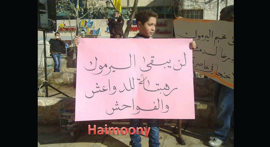 صورة لافتة رفعت ضمن حملة بدنا نعيش في مخيم اليرموك كتب عليها "لن يبقى اليرموك رهينة للدواعش والفواحش"..