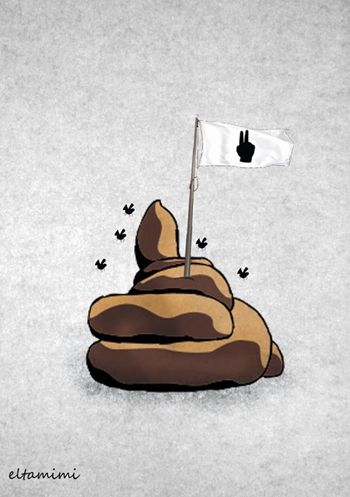لوحة ساخرة للفنان التميمي تظهر علم الجماعات الإسلامية معلق على كتلة من الفضلات ضمن حملة
