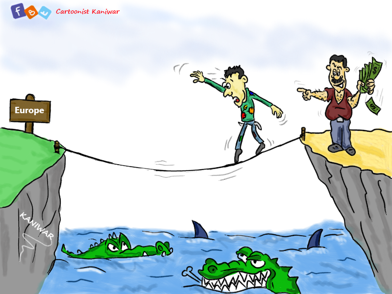 عمل للفنان كانيوار زيدان يصور معاناة المهاجر السوري مع المهرب الذي يدفعه باتجاه الموت طمعاً بكسب المال فقط....