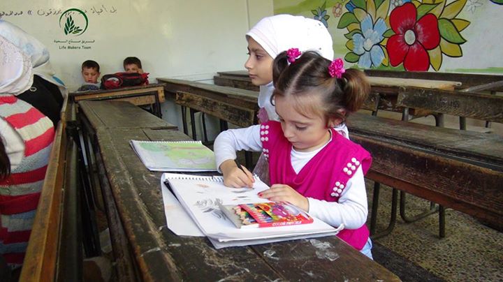 طفلة منغمسة بالرسم على المقعد الدراسي ضمن فغاليات صناع الحياة