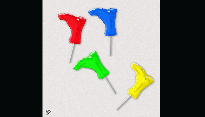 عمل فني للفنان جواد يصور مجموعة أحذية ملونة تتساقط من السماء...