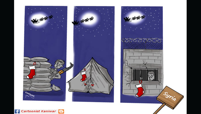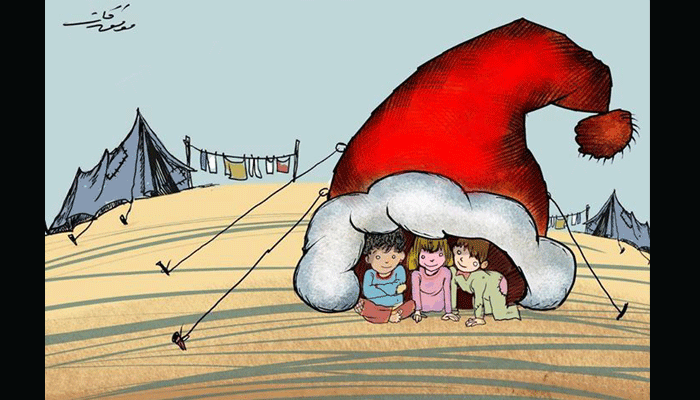 الفنان السوري "فارس الحلو" اختار زاوية مغايرة وملفتة ليودع العام من خلالها، إذ اختار صورة قديمة لطفل سوري زوّر بطاقة إعانة ليحصل على مساعدات، قائلا له: "كل سنة وأنت سالم أيها الجميل. طفل سوري صنع بطاقة إغاثة بنفسه ليعيل أهله"، وكأنه يريد أن يذكر بطريقة غير مباشرة بما يعيشه ملايين اللاجئين السوريين من أوضاع إنسانية سيئة، وهو ما عبر عنه الفنان "موفق قات" بلوحة ترسم مجموعة من الأطفال السوريين يحتمون بقبعة بابا نويل التي أصبحت خيمة لجوء، في حين رسم الفنان "كانيوار زيدان" أطفال سوريا في العيد وهم موزعون بين مخيم وحرب ومعتقل.