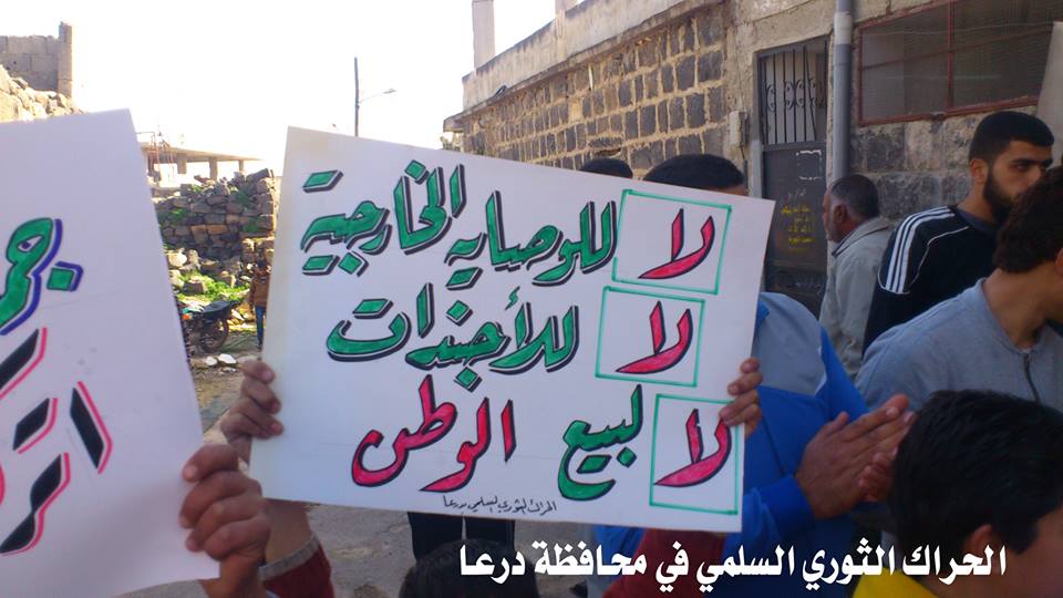 كرتونة كتب عليها لا للوصاية الخارجية لا للأجندات و لا لبيع الوطن لتذكر الناشطين بعدم الإنجرار وراء الدعم الخارجي الذي لديه اجندات داخليه في سوريا