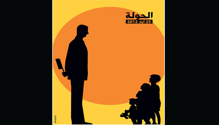 With striking colors and simple silhouettes, Syrian-French graphic designer Fares Cachoux commemorates the gut-wrenching massacre of al-Houla, which killed 108 people, most of them children, on May 25, 2012. In his artwork, the tall, black figure of Assad, caches a knife behind his back, as he ogles a group of young children. The poster, which found its way to the French curriculum and the French website Le Huffington Post, became the first in a series of posters that convey the struggle of the artist’s homeland.
