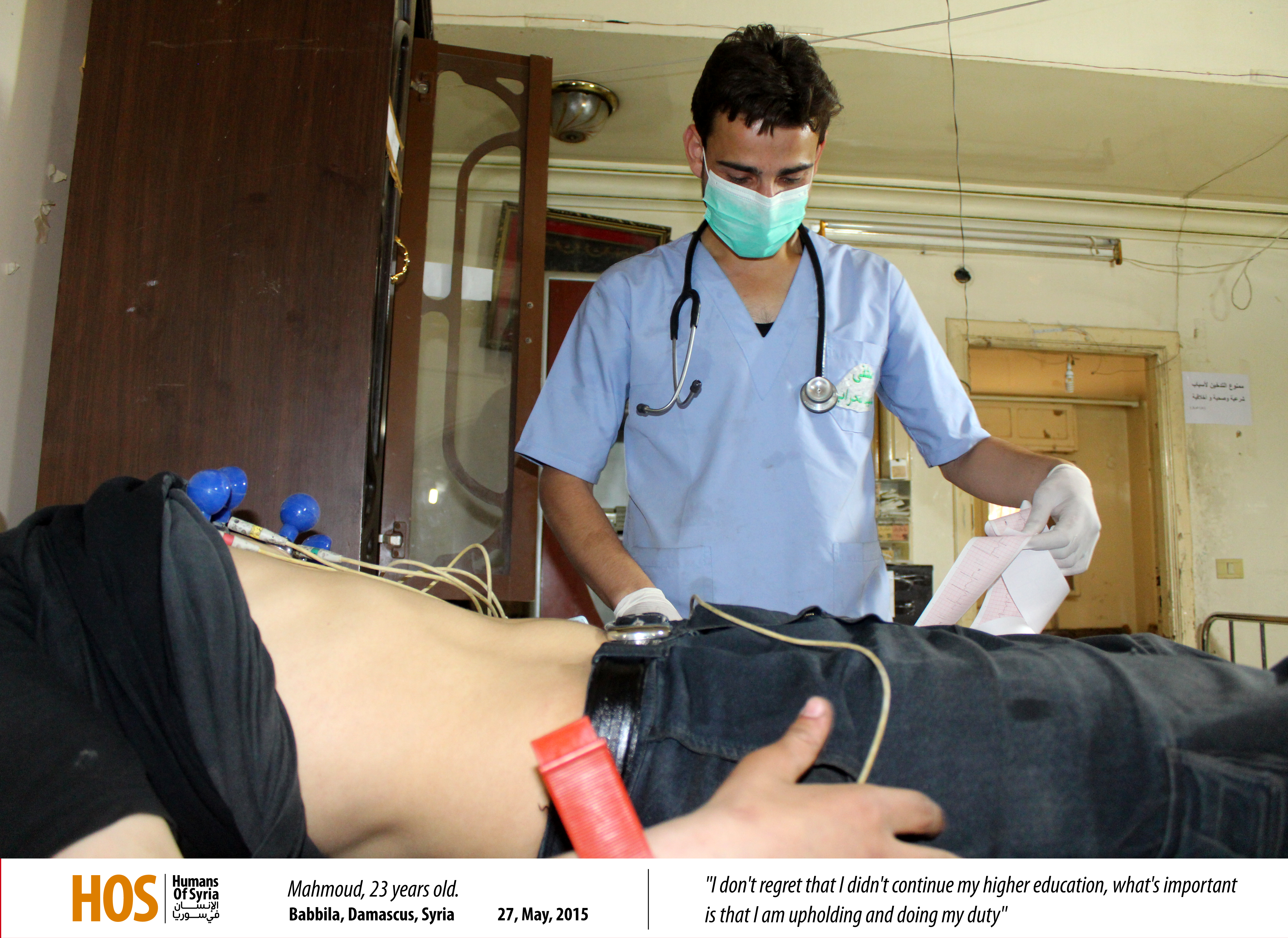 Mahmoud, 23 years old law student, also chose to join the uprising over continuing his studies. Today, he serves as a field nurse and paramedic in a Babbila clinic, also under siege.
