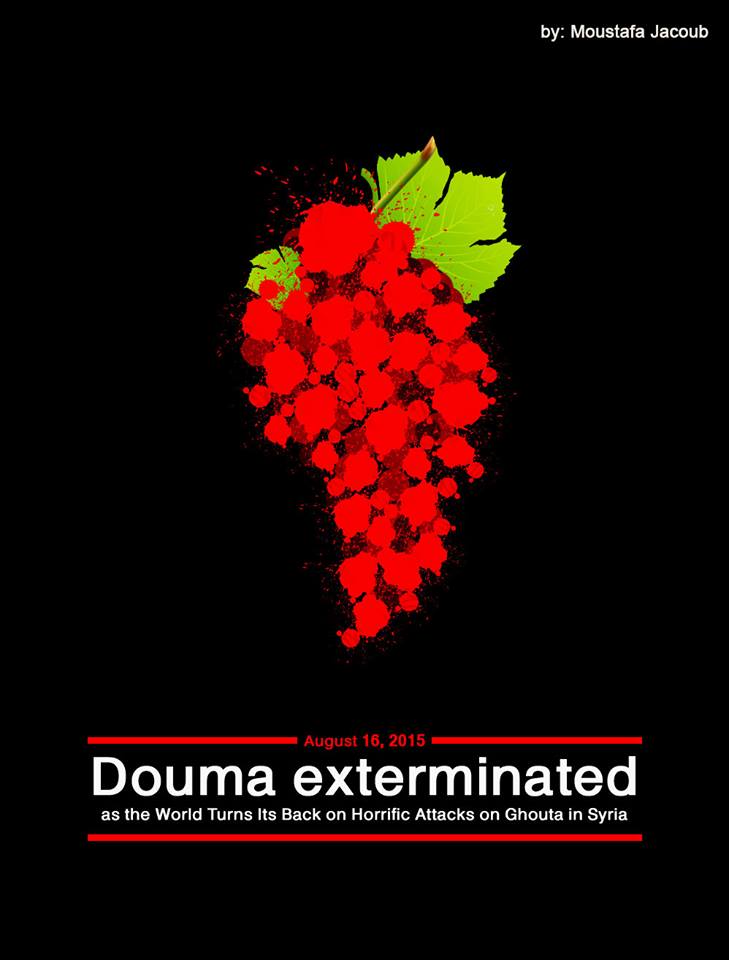 واختار الفنان مصطفى يعقوب أن يعبر عن المجزرة برسم يستوحي عنب مدينة دوما، حين رسم عنقود عنب أحمر مرفقا بعبارة "دوما تباد"، في حين رسن الفنان "هاني عباس" لوحة تبين رجلا يحمل طفلا مصابا ويهرب به بعيدا عن سوريا والكرة الأرضية كلها.