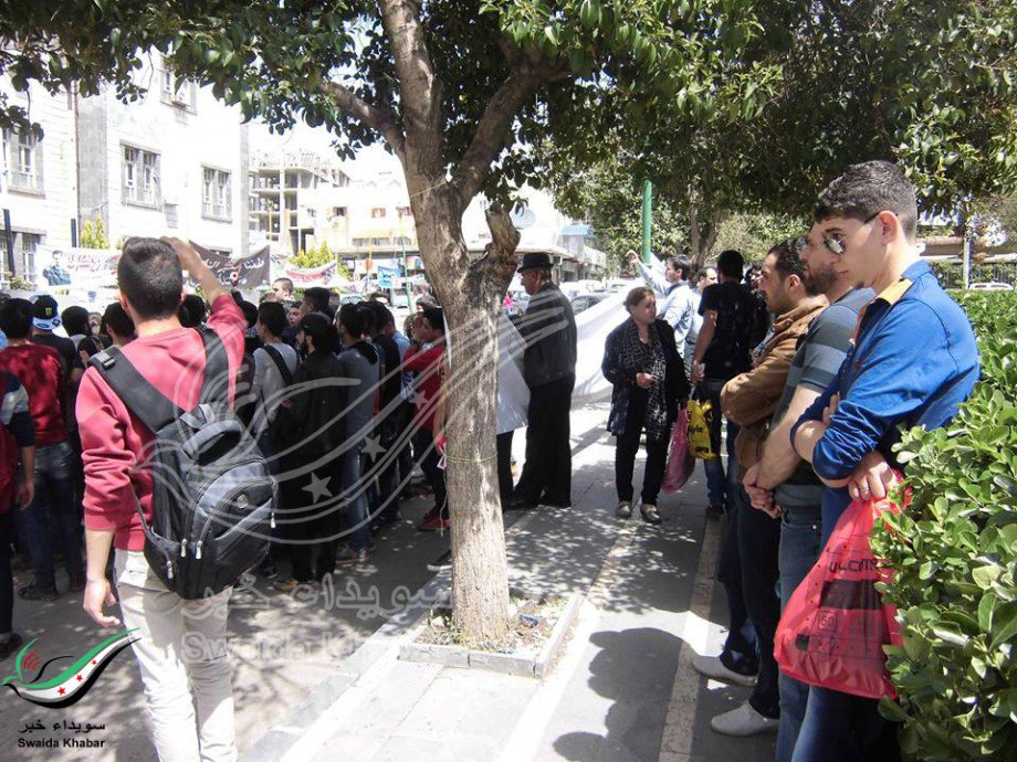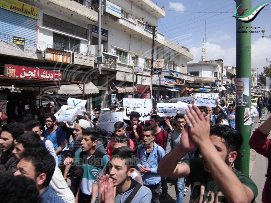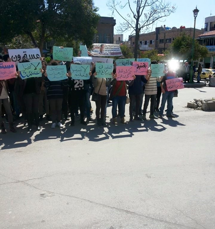 ![[From the protest held in front of the local branch of the Ministry of Education/Source: Sweida News Network Facebook page - Sweida - 23-3-2016].](http://www.syriauntold.com/wp-content/uploads/2016/04/23-آذار-720x768.jpg)