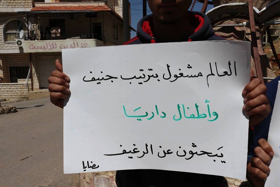 [“As the world is busy planning the Geneva talks, children are looking for a loaf of bread,” reads a sign held by a Madaya resident in solidarity with Darayya - 19-4-2016. (Source: The Local Council of Darayya, Facebook)].Darayya’s strategic location means that a truce is highly unlikely; the regime wants to control the city at any cost. It is located seven kilometers from the presidential palace and two kilometers from the Council of Ministers in Kafr Sousah, and near the Mezzeh Military Airport. Furthermore, it is in between the restive neighborhoods of Midan, Qadam, Muʿadamiyat ash-Sham, and Jdeidat Artouz. Consequently, the regime continues to try to regain control by advancing the narrative that “terrorists” are present in the city, most recently announcing the killing of 37 of them under government shelling on February 10, 2016.
