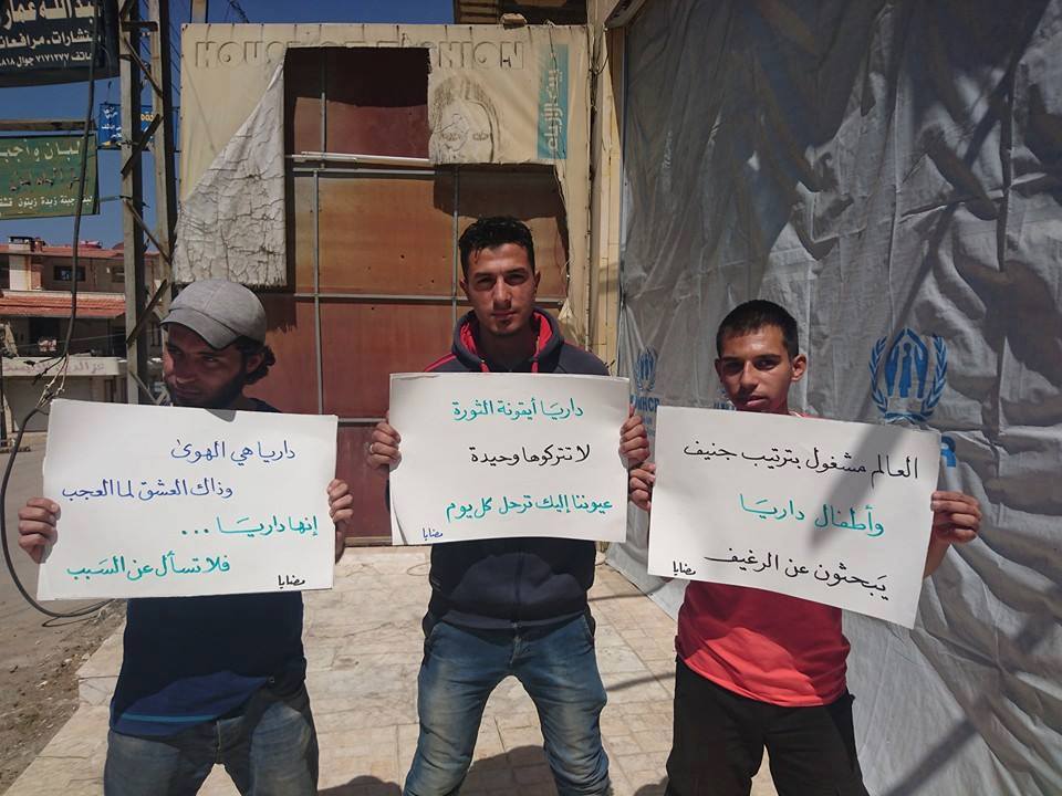 [Other banners from the demonstration held in Madaya in solidarity with besieged Darayya. The one in the middle reads: “Darayya is the icon of the revolution. Do not abandon it. We will give anything for it." - 19-4-2016. (Source: The Local Council of Darayya, Facebook)].
