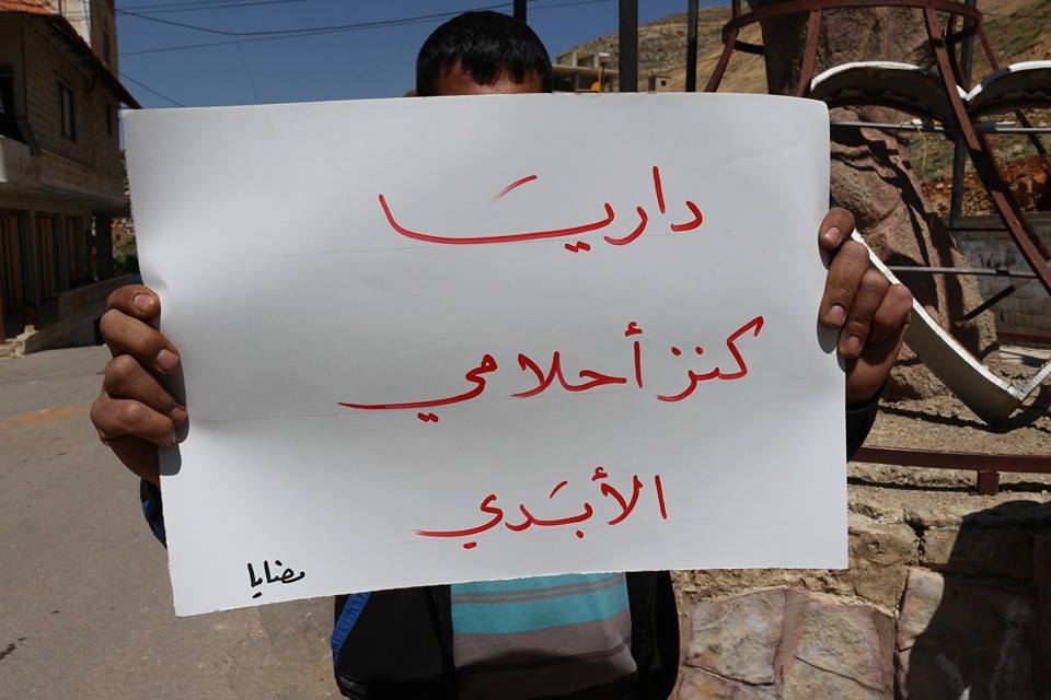 [“Darayya: A treasure of my eternal dreams,” reads a sign held by a resident of Madaya in solidarity with Darayya - 19-4-2016. (Source: The Local Council of Darayya, Facebook)].In addition to its unique peaceful activists, Darayya was distinguished by its robust Local Council, which acted as the independent administrative force in the city, leaving its legislative and judicial institutions autonomous from the various armed opposition battalions in the area. In late January, nonetheless, a battle successfully waged by the regime to separate neighboring rebel-held Muʿadamiyat ash-Sham from Darayya has forced the legislative work to a halt. However, the iron-clad structure of the Local Council has prevented the disintegration of the civil revolutionary movement in Darayya despite the siege imposed by the regime and its allies since 2012.
