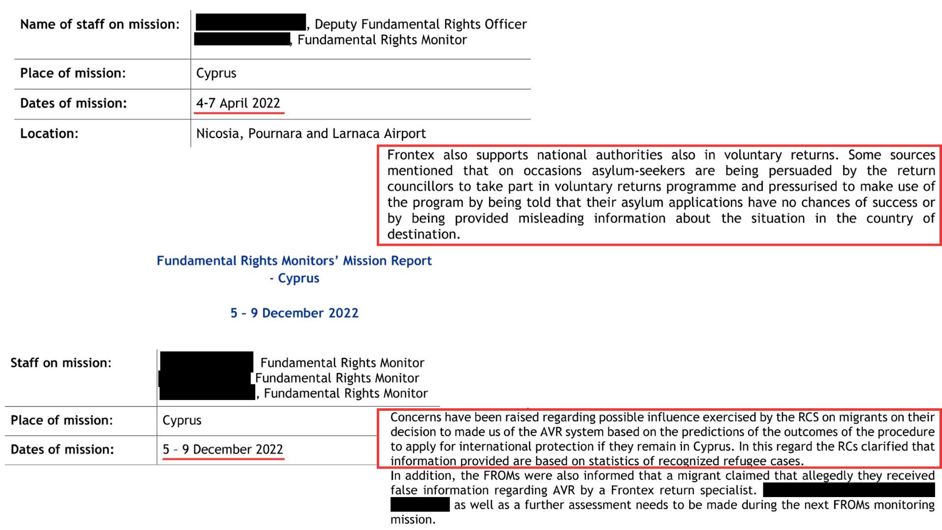 منذ نيسان/أبريل 2022، سجّل مراقبو الحقوق الأساسيّة في فرونتكس عدّة حالات تعرّض فيها طالبو لجوء لـ"ضغوط" من أجل الانضمام إلى برامج العودة الطوعيّة. وقد أُبلغ بعضهم بمعلومات مضلّلة عن الأوضاع في بلدانهم الأصليّة، وقيل لهم إنّ فرص قبول طلبات لجوئهم تكاد تكون معدومة.