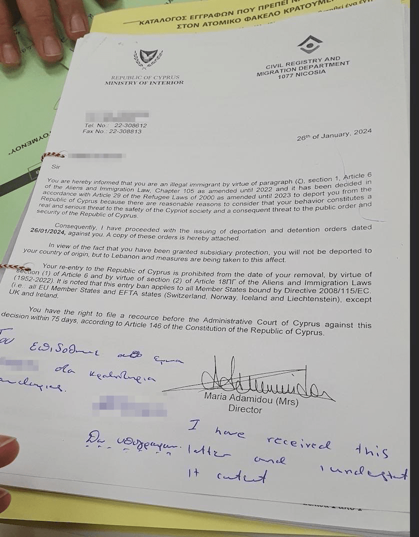 يكشف تحقيقنا عن واقعٍ مختلف. إذ تستخدم وزارة الداخليّة القبرصيّة أساليب الإكراه والخداع لدفع الأفراد إلى قبولِ العودة "الطوعيّة"، وذلك على حساب التزامات الدولة بموجب الاتفاقيّة الأوروبيّة لحقوق الإنسان.