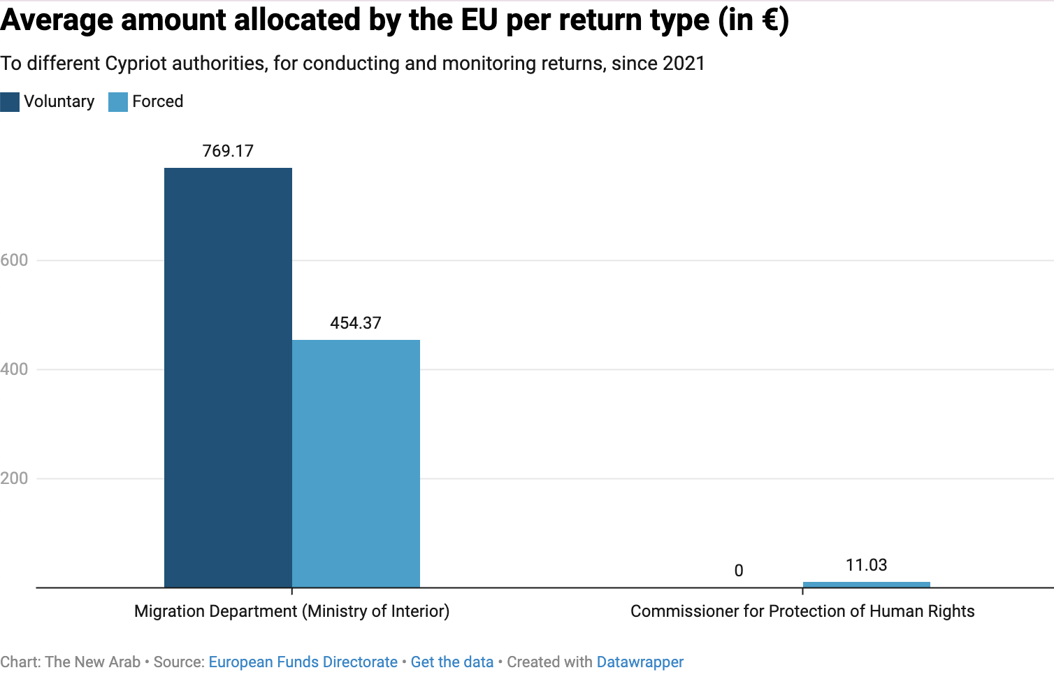 خصّص الاتحاد الأوروبيّ مبلغاً زهيداً قدره 121,547 يورو (125,795 دولاراً) لمفوّض حقوق الإنسان في قبرص لمراقبة عمليّات الترحيل القسريّ بين تمّوز/يوليو 2022 وكانون الأوّل/ديسمبر 2027.