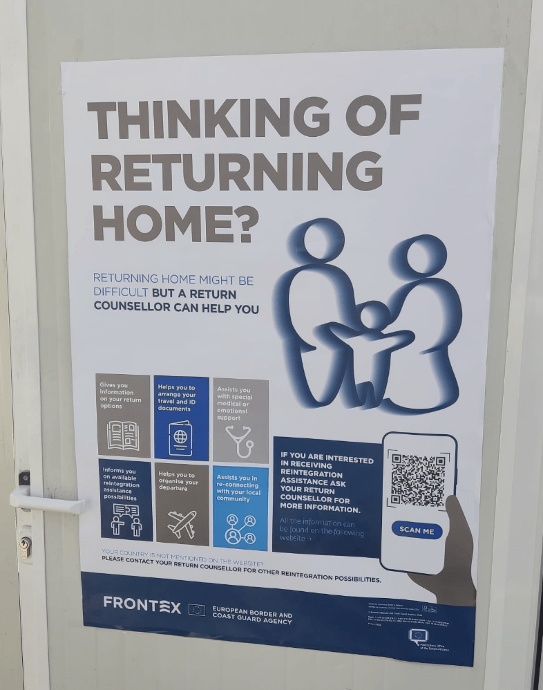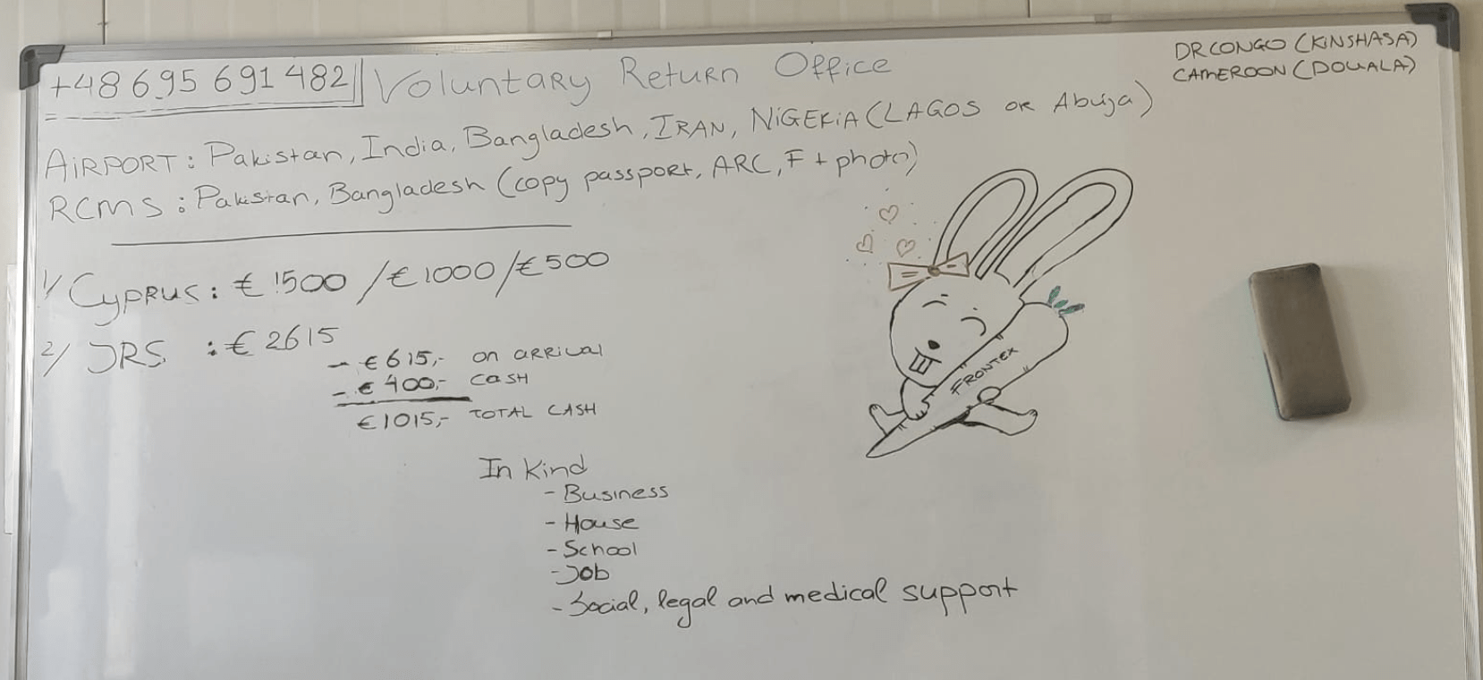 أوضح موظّفو فرونتكس للوفد الزائر أنّ مُعظم طالبي اللجوء يفضّلون التسجيل في برنامج العودة الطوعيّة الذي تُديره الحكومة القبرصيّة، بدلاً من البرنامج الأوروبيّ لإعادة الإندماج المموّل من فرونتكس، لأنّه يمنحهم تعويضاً ماليّاً أكبر يُسلّم لهم مباشرة قبل صعودهم إلى الطائرة.