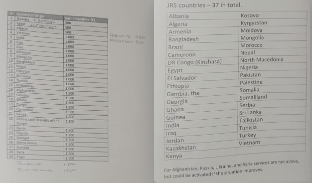 فخلافاً لفرونتكس، تعرض قبرص على الراغبين بالعودة الطوعيّة من سوريا وإيران وأفغانستان مبلغاً يتراوح بين 1,000 يورو (1,035 دولاراً) و1,500 يورو (1,553 دولاراً) كمكافأة للترحيل. وقد شكّل المتقدّمون من هذه الدول الثلاث ما نسبته 75% من إجماليّ طلبات اللجوء التي تلقّتها قبرص في الأشهر الإحدى عشر الأولى من عام 2024.