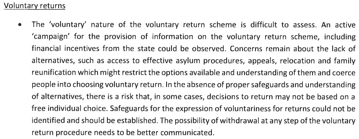 وفي غياب رقابة كافية، قد تُعتبر قبرص مخالفة للاتفاقية الأوروبيّة لحقوق الإنسان بسبب برنامج العودة الطوعيّة الذي تُنفّذه.