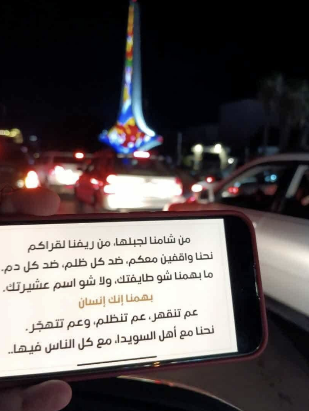 Different solidarity mobilisations took place also in Damascus. Paper flyers appeared in the streets, carrying a clear message of solidarity: "From our Levant to our Mountain, we stand with you against all injustice, against all bloodshed. We don't care what your sect is, what matters is that you are a human being. We are with the people of Sweida".