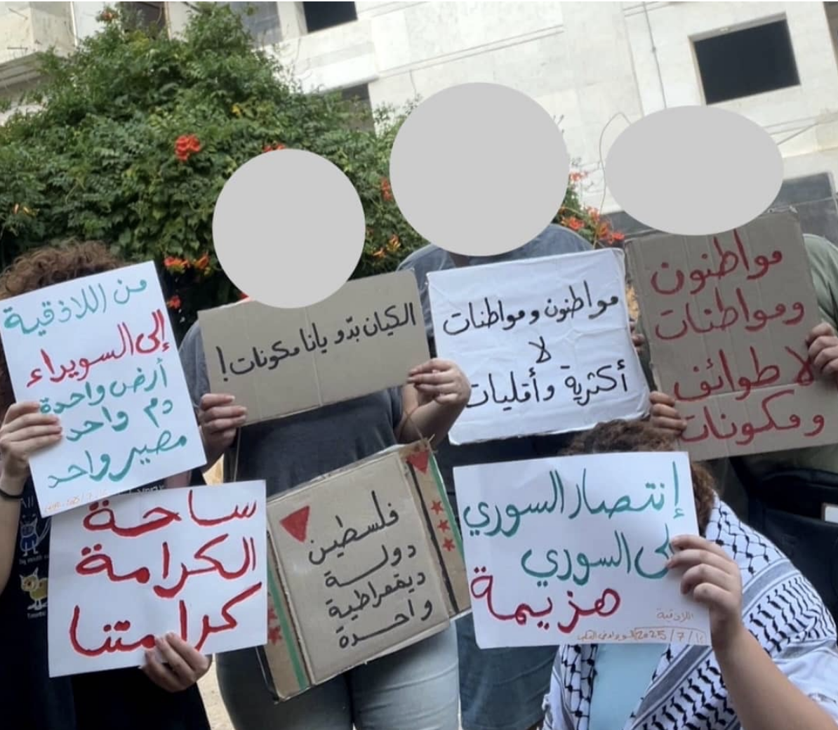 On July 16, a civil campaign organized by activists in Latakia launched a protest in support of civil peace and in solidarity with the people of Sweida. During the protest, they raised slogans against sectarianism and the Israeli attacks. The participants decided to hide their faces, fearing for their safety and the possibility of random reprisals.