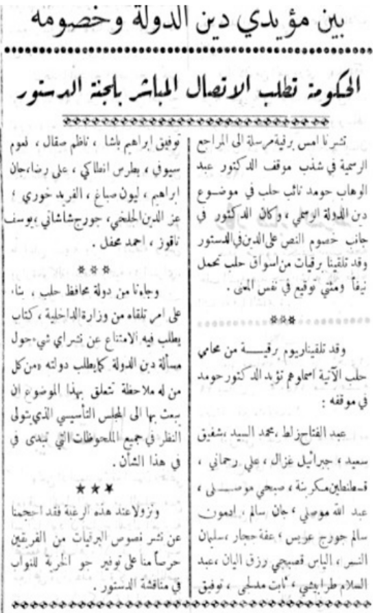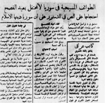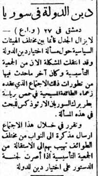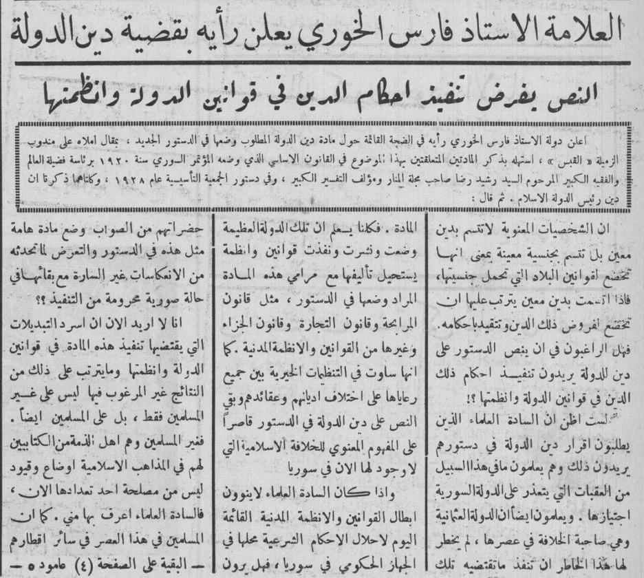 تناقلت الصحف انتقادات رجل القانون والاستقلال فارس الخوري* لمادة دين الدولة، نقتطف منها: "وإذا كان السادة العلماء لا ينوون إبطال القوانين والأنظمة المدنية القائمة اليوم لإحلال الأحكام الشرعية محلها في الجهاز الحكومي في سوريا، فهل يرون حضراتهم من الصواب وضع مادةٍ هامة مثل هذه في الدستور والتعرض لما تحدثه من الانعكاسات غير السارة مع بقائها في حالةٍ صورية محرومة من التنفيذ؟؟ أنا لا أريد الآن أن أسرد التبديلات التي يقتضيها تنفيذ هذه المادة في قوانين الدولة وأنظمتها وما يترتب على ذلك من النتائج غير المرغوب فيها ليس على غير المسلمين فقط، بل على المسلمين أيضاً. فغير المسلمين وهم أهل الذمة من الكتابيين لهم في المذاهب الإسلامية أوضاعٌ وقيود ليس من مصلحة أحد تعدادها الآن، فالسادة العلماء أعرف بها مني."