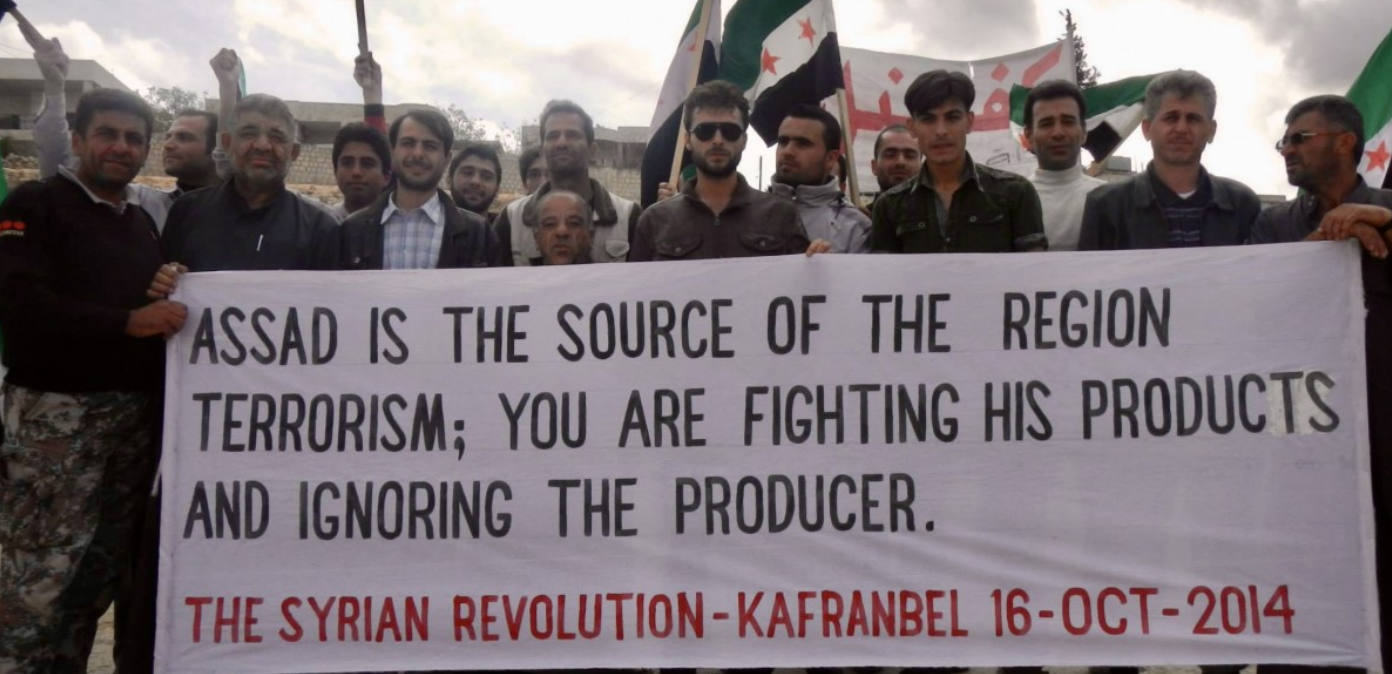 “Go look at any photograph of Kafr Nabl’s now-famous revolutionary banners and cartoons, and Khaled will probably be there, holding the banner. And if he’s not in the photo, he most likely made the banner or took the photograph”.