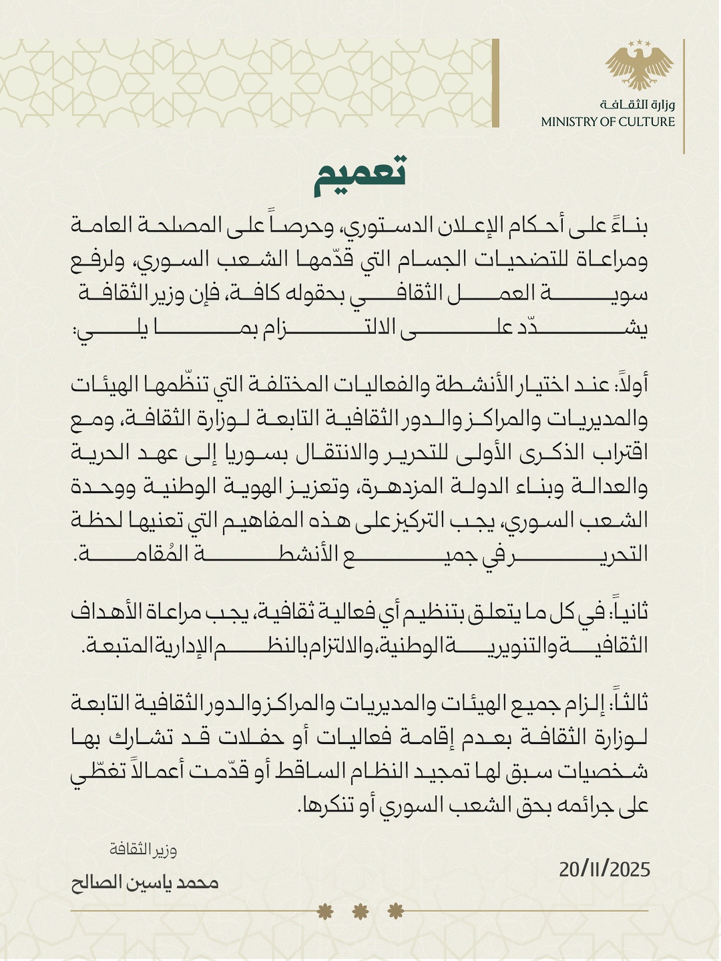 [2] تمَّ تعيين محمد ياسين صالح وزيرًا للثقافة في ٢٩ آذار/مارس ٢٠٢٥.