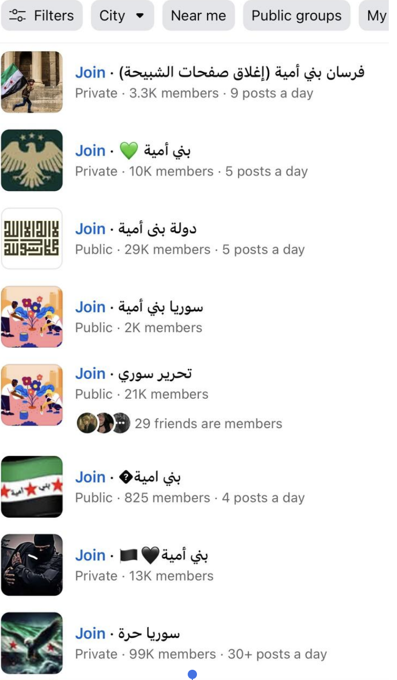 انتشرت على فيسبوك وبقية وسائل التواصل الاجتماعي عشرات الصفحات والمجموعات التي تحمل أسماء مثل "سوريا الأموية" أو "بنو أمية". تمزج منشورات هذه الصفحات بين رموز وطنية ونبرات دينية، لتُنتج فضاءً رقمياً تُقدَّس فيه الذاكرة، ويُكسى التاريخ بطابع جمالي يخفي تعقيده، ويُعاد تقديمه بوصفه صورةً مثالية ومرجعيةً أخلاقية في آنٍ واحد.
