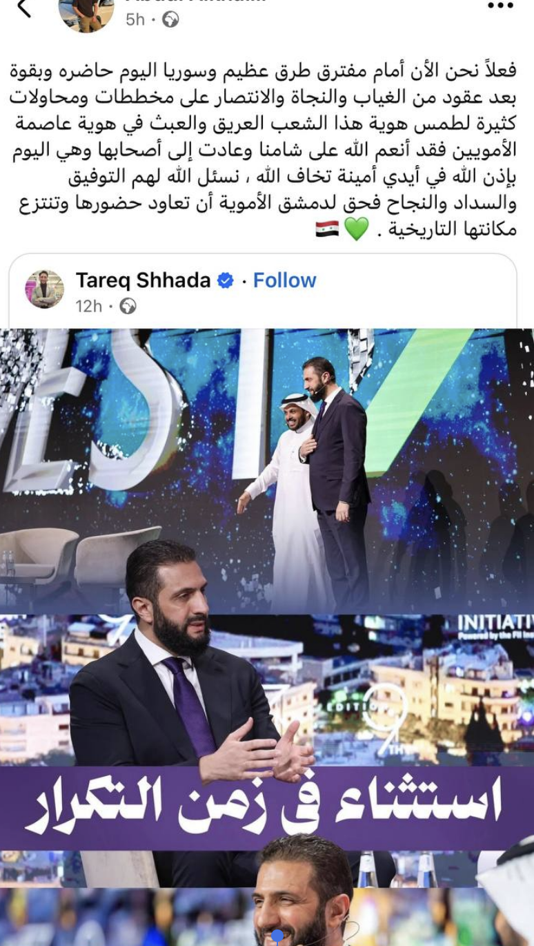 في هذا الخطاب المتحوّل، لا تعود "دمشق عاصمة الأمويين" مجرد شعار؛ إنها أسطورة وجدانية، وعدٌ بالطهارة والبعث، في مخيال عربي-سنّي يسعى إلى استعادة تماسكه، عبر استدعاء زمنٍ متخيَّل كأصل نقي.