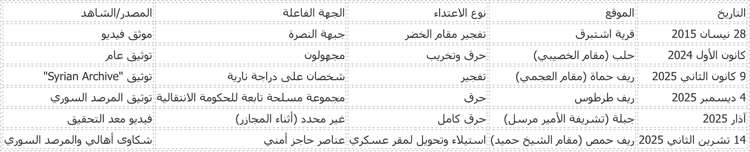في الخامس من آذار/ مارس ٢٠٢٥ تعرّض مقام الشيخ ناصر أسعد في قرية تل عبد العزيز بريف حماة لتفجير أسفر عن هدمه بالكامل تبنته "سرايا أنصار السنة" وفقًا للأرشيف السوري. وفي 14 تشرين الثاني /نوفمبر 2025 اتخذ عناصر حاجز أمني مقام الشيخ حميد "أحمد بن بطة الشامي" على طريق المخرم بريف حمص الشرقي، مقرّاً لهم، ما دفع الأهالي إلى تقديم شكاوى رسمية.