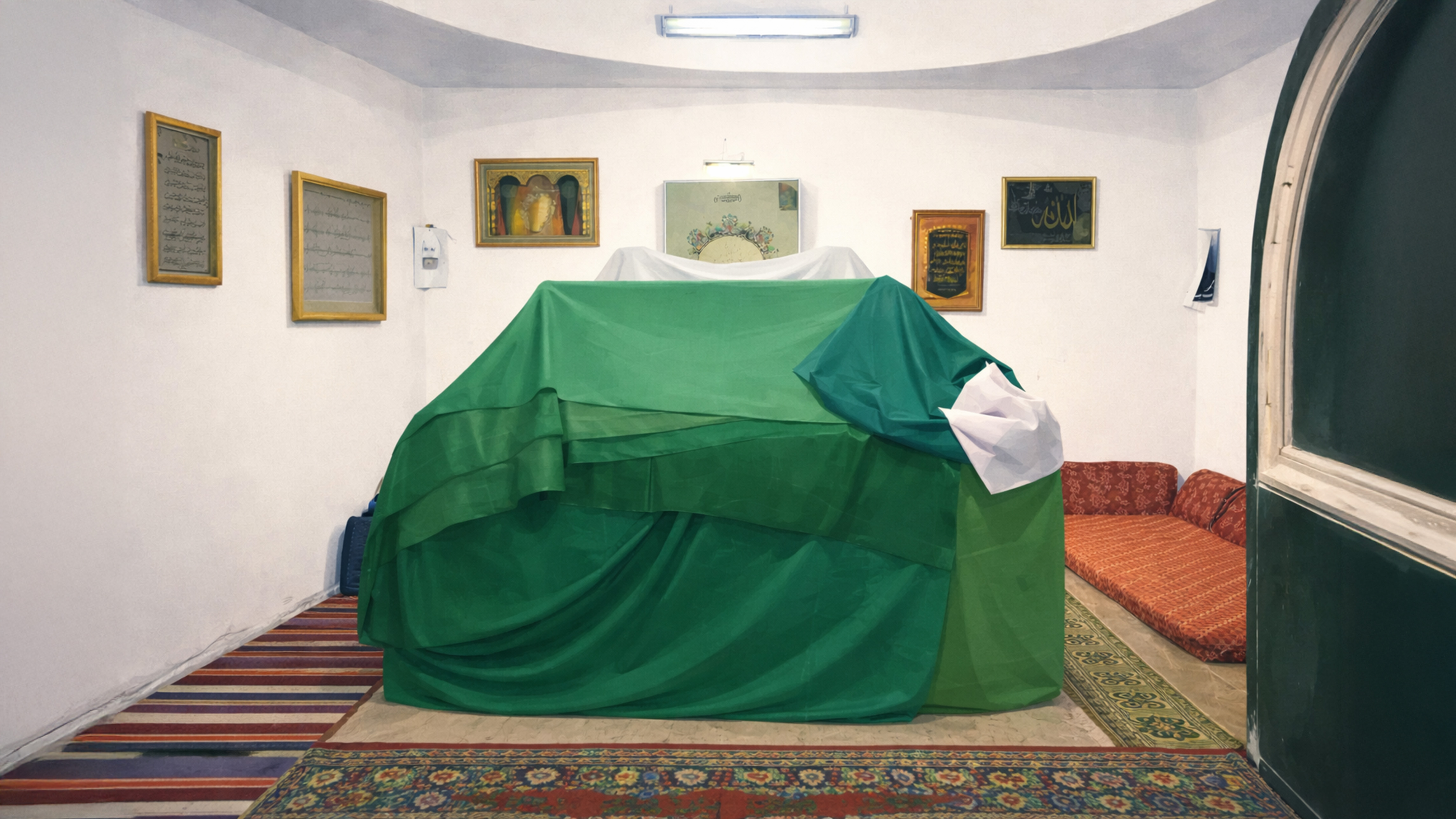 عندما وصلت مريم باب المقام صعدت بضع درجات، جلست لاهثةً وتنفّست بعمق رائحة البخور التي تعرفها جيداَ. في الداخل بدا المشهد أقرب لمخيّم صغير، عشرات النساء يفترشن الأرض مُحدّقات بشاشات الهواتف المحمولة وأطفال يضجون بصخب حول الضريح ذي الغطاء  الأخضر والصندوق الحجري الذي يضم نسخاً مختلفة من القرآن الكريم.