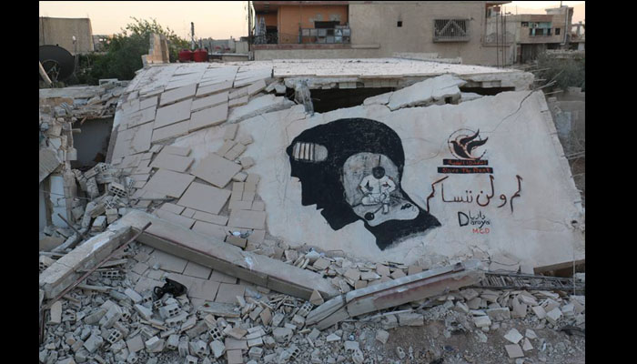 على جدار داريا المهدمة، وجدران حي القابون الدمشقي المحاصر بالموت وحي الوعر المحاصر على وقع موت لا يتوقف، ثمة رسوم ولافتات يرسمها محاصرون لمعتقلين في سجون النظام المستبد، وكأن المحاصر أكثر من يشعر بألم المعتقل فتغدو رسومه ورسائله إليه، و كأنها رسائل من الذات المحاصرة للذات المعتقلة.
