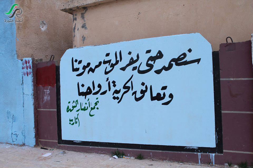 لم يشأ ناشطو تجمع "أنصار الثورة" أن يطفؤوا عام 2014 دون شمعة تنير شيئا من الظلام، مصممين على أن "سوف نبقى هنا حتى يزول الألم"، و "سنصمد حتى يفر الموت من موتنا وتعانق الحرية أرواحنا" كما تقول الشعارات التي كتبوها على جدران مدينة الأتارب في 14 ديسمبر 2014، مطلقين فعالية "ثورتنا بالألوان".